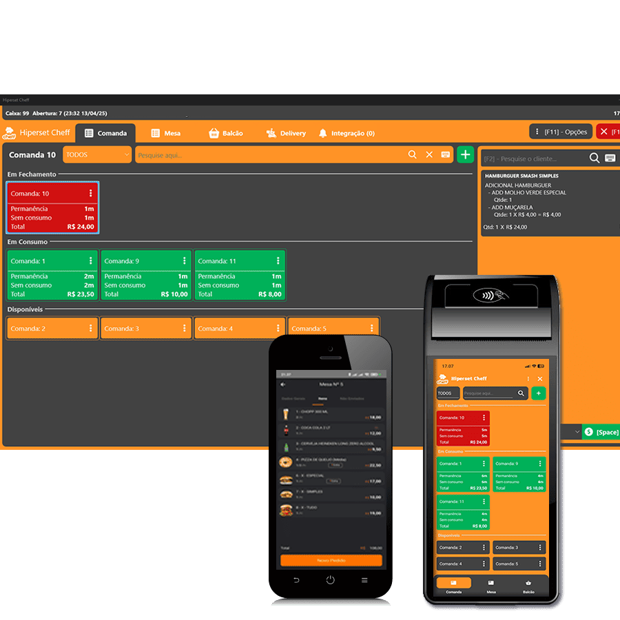 Sistema para área alimentícia que gerencia mesas, comandas e totens de autoatendimento, operando de forma multiplataforma para agilizar pedidos, minimizar filas e elevar a experiência do cliente